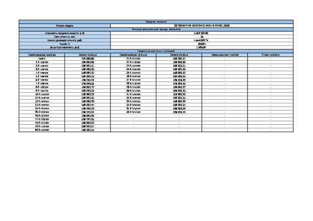 Стоимость предмета лизинга 3 629 500,00 руб, аванс 20,00% - 725 900,00 руб, срок лизинга – 36 мес, сумма договора лизинга - 4 664 059,72 руб, ежемесячный платеж 109 393,33 руб. В нашем предложении комиссия за рассмотрение заявки – 0 руб. Приобрети оборудование могут не только работающие компании, но и стартапы (важно для всех – наличие медицинской лицензии). Существует и возможность нулевого аванса, что рассматривается в индивидуальном порядке (обычно при наличии дополнительного залогового имущества). Однако следует иметь ввиду, что чем больше аванс и чем меньше срок лизинга, тем выгоднее будет покупка. Возможны: выкуп на ФЛ, досрочный и частично-досрочный выкуп, лизинговые каникулы до 3 мес, сезонные графики платежей.