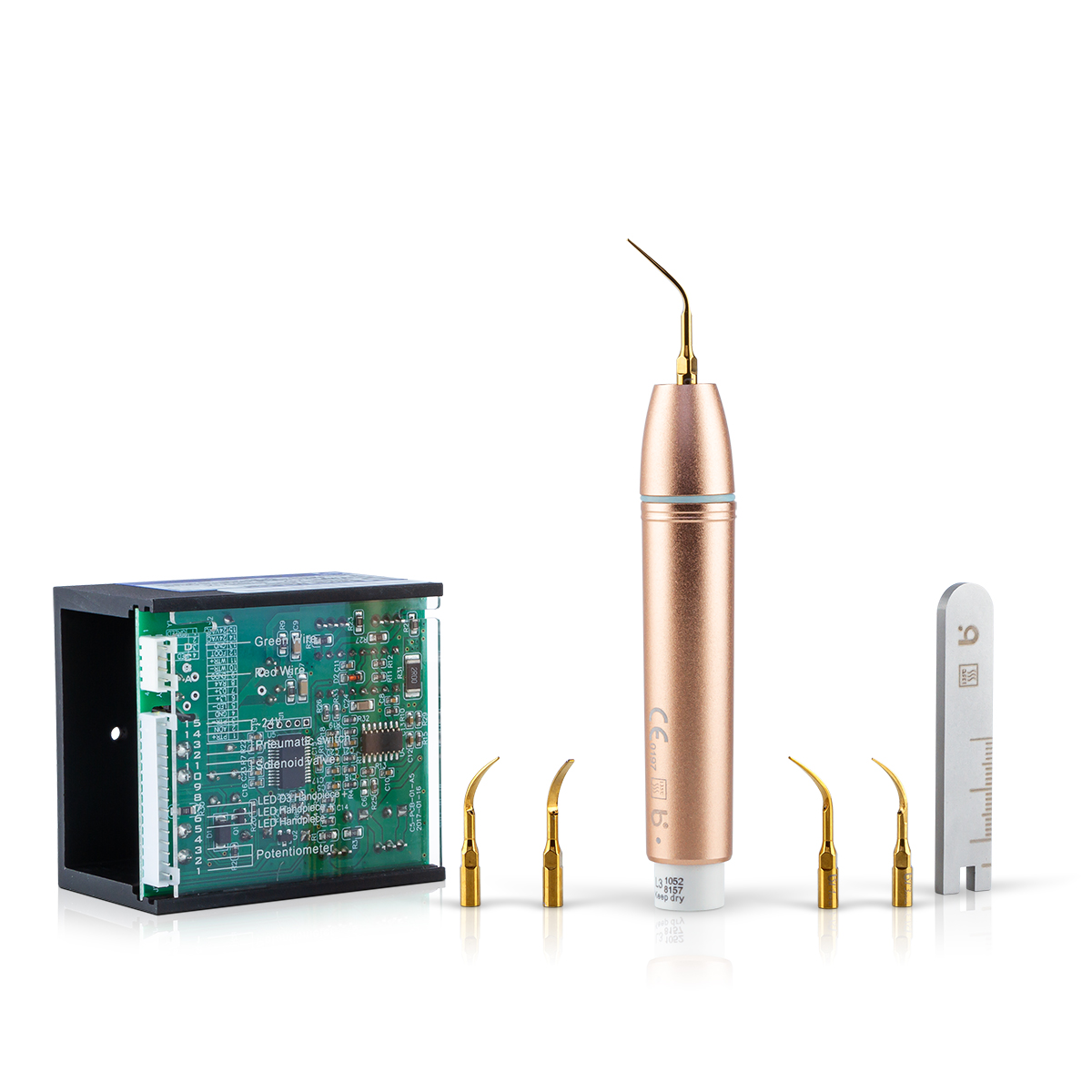 Скейлер поддерживает режимы работы «Scaling» и «Perio». Наконечник для режима «Perio», то есть удаления зубного камня выполнен из твердого сплава, что гарантирует ему долгий срок службы. Также он оснащен системой мелкокапельного орошения.
