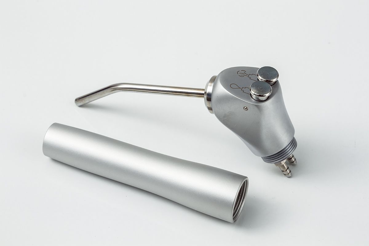Подает воду и воздух, смесь из воды и воздуха, состоит из ручки и носика. Соединен шлангом со столиком врача. Выполнен из дюралевого сплава.