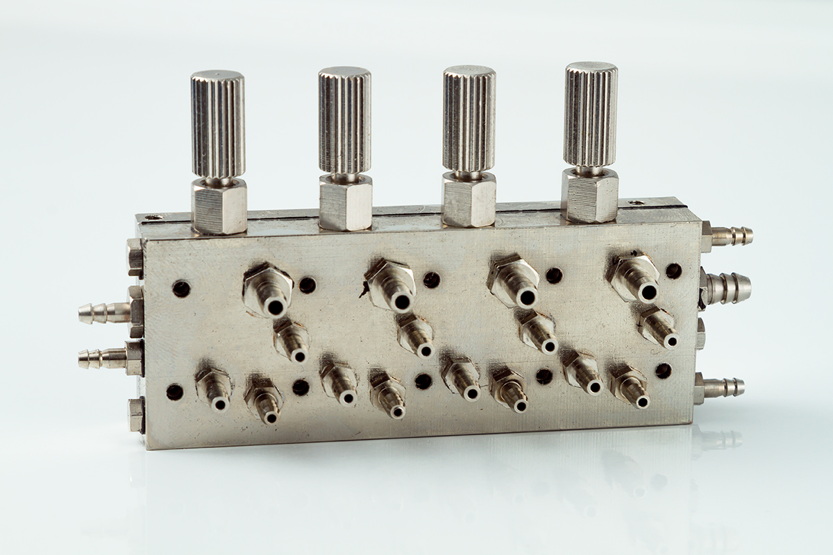 Регулирует подачу воздуха на инструмент. Сделана из частей металлического и латунного сплавов, имеется 4 краника регулировки давления воздуха на 4 инструмента. Расположена в столике врача.